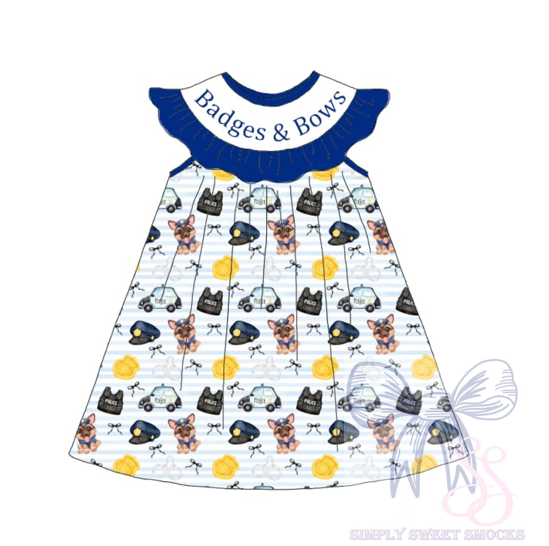 Design: Playful police badges with a sweet bow accent, plus our sewn-in business tag